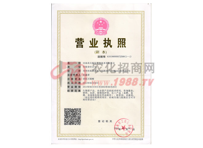 證書名稱:營業(yè)執(zhí)照 發(fā)證機構(gòu):河南農(nóng)夫稼園生物技術(shù)有限公司