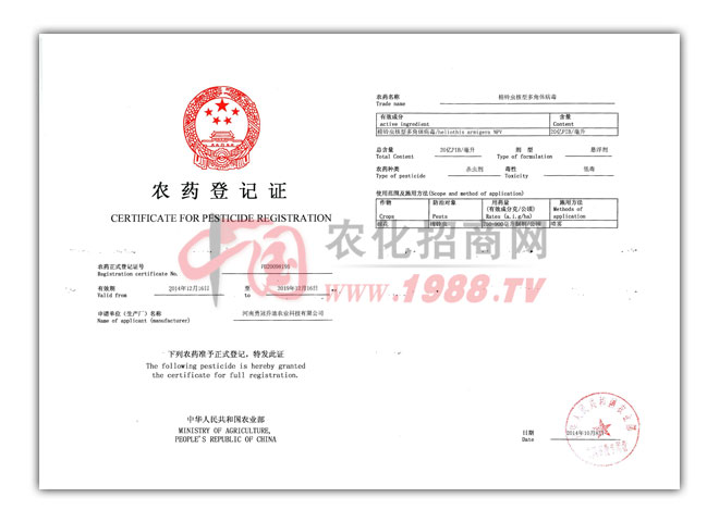 公司主導(dǎo)產(chǎn)品“蛤蟆王”“勇冠”牌NPV棉鈴蟲病毒殺蟲劑,被認(rèn)定為河南省批高科技產(chǎn)品和新產(chǎn)品,被列入國家“八五”火炬計(jì)劃項(xiàng)目,2001年,其年產(chǎn)5000噸棉鈴蟲病毒殺蟲劑工程,被推薦列入國家高技術(shù)產(chǎn)業(yè)化推進(jìn)項(xiàng)目。
