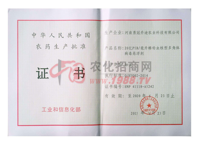 河南勇冠喬迪農(nóng)業(yè)科技有限公司(原禹州市百靈生物藥業(yè)有限責(zé)任公司),是從事病毒類生物農(nóng)藥生產(chǎn)的企業(yè)。我公司是河南省高新技術(shù)企業(yè),ISO9001:2000國際質(zhì)量體系認(rèn)證企業(yè)。
